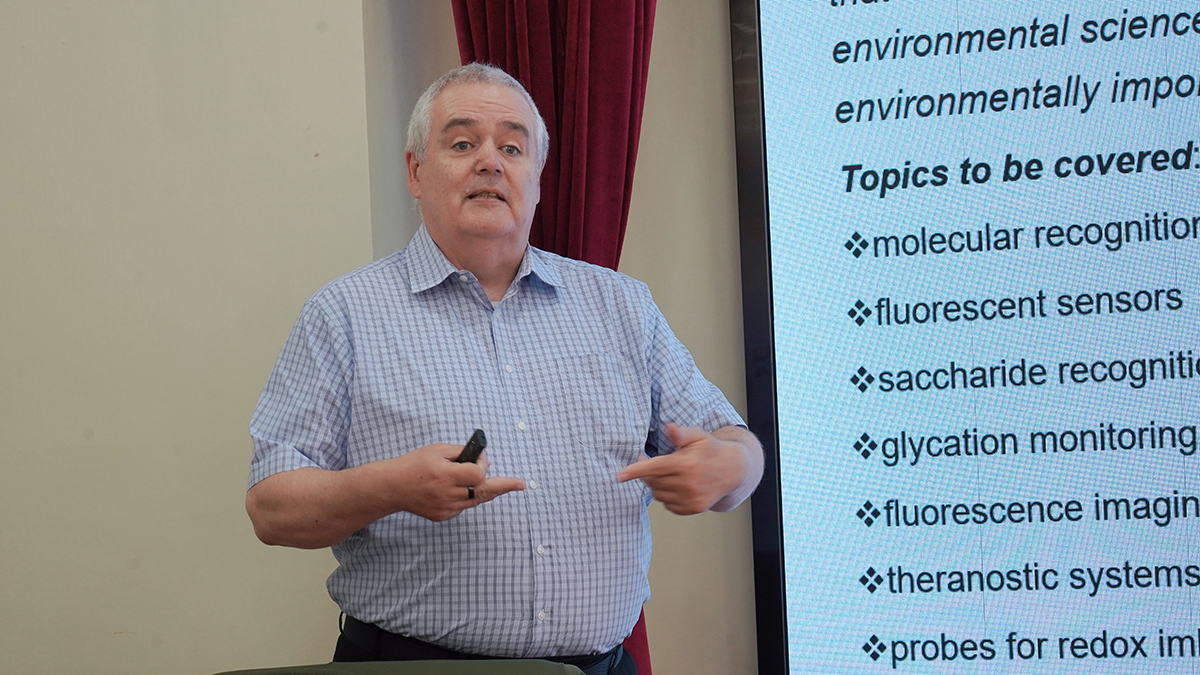 James教授以“Fluorescent Chemosensors and Imaging Agents(荧光化学传感器与荧光成像)”为题,全面介绍了其团队在在荧光传感器设计、构建及应用方面的研究,详细阐述了荧光传感器的设计原理、糖类分子识别、氧化还原失衡成像和诊疗一体化技术开发等。在交流环节,参会学者与James教授围绕荧光成像技术在植物学领域的应用、科技论文写作与投稿等问题进行了热烈探讨,现场氛围轻松活泼。