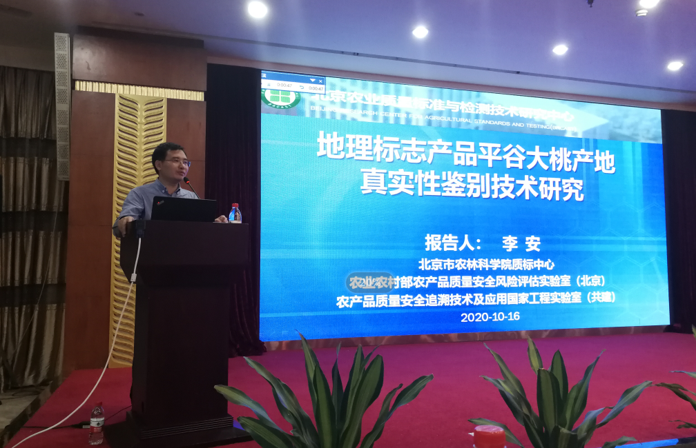2020年10月16-17日,质标中心韩平副研究员、李安副研究员等4人赴杭州参加2020年农产品品质评价与溯源技术研讨会,李安副研究员在会上作了题为《地理标志产品平谷大桃产地真实性鉴别技术研究》的学术报告。