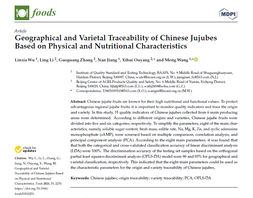 红枣为深受大众所喜爱的一种食药同源农产品,具有重要的营养和功能价值,素有“日食三枣,长生不老”之说。为保护区域优势红枣,北京农科院质标所联合北京市农产品质量安全中心,构建了适用于红枣的品质指标评价体系。该体系通过对红枣的食味品质、商品品质和营养品质等基础指标的检测分析,结合化学计量学,成功实现了5个产地及6个品种的红枣鉴别。相关研究已发表在国际食品科技领域知名期刊《Foods》(IF: 4.350)“Geographical and Varietal Traceability of Chinese JujubesBased on Physical and Nutritional Characteristics”。