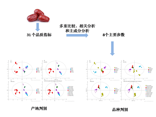 该研究的样品来自5个红枣主产区的6个品种,检测分析了食味品质、商品品质和营养品质共计31个指标。为了简化参数,首先基于多重比较、相关分析和主成分分析(PCA),筛选了8个主要特征性品质指标,并客观、全面地评价了枣的内在品质。再根据8个主要参数,线性判别分析(LDA)分类准确率为100%。正交偏最小二乘判别分析(OPLS-DA)模型的对测试集样本进行产地和品种分类,其判别准确率分别为90%和93%。这为不同地区、不同品种红枣主要品质参数的确定提供了理论依据,对红枣的产地和品种溯源具有重要意义。