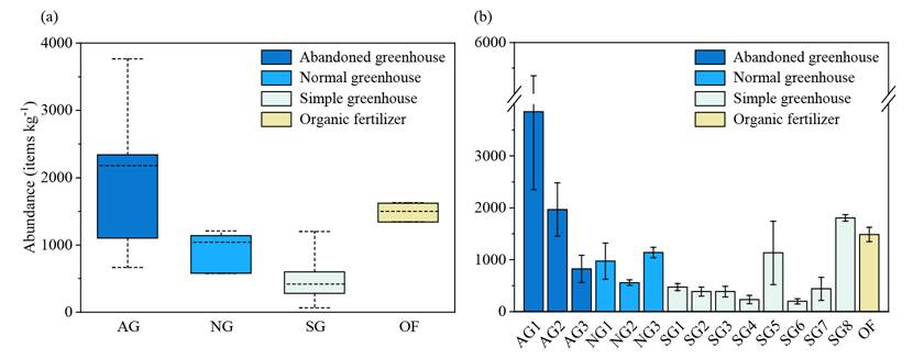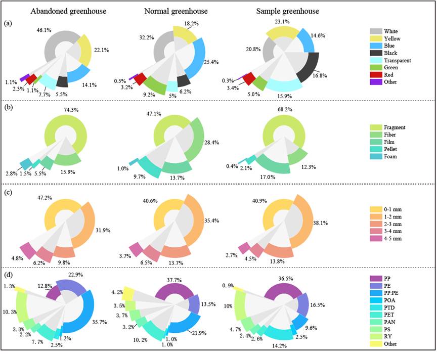 鉴于此,质标所科研团队对不同类型的设施农业(荒废暖棚、正常暖棚、简易大棚)微塑料的污染特征和来源进行了深入研究。研究表明:设施农业中微塑料的丰度要显著高于传统农业,不同类型的设施农业中微塑料的污染程度为:荒废暖棚(2215.56±1549.86个/kg)>正常暖棚(891.11±316.71个/kg)>简易大棚(632.50±566.93个/kg)。正常暖棚浅层土壤(0-10cm)中微塑料的丰度低于深层土壤(10-20cm),表明频繁的耕种可能会导致微塑料向深层土壤的迁移。设施农业中微塑料的污染特征呈现以下特点:形状以碎片为主,小于1mm粒径的微塑料的比例最高,微塑料的类型主要是聚丙烯(PP),且不同类型设施农业之间存在显著差异。来源分析进一步表明:除地膜外,有机肥(1486.67±140.48个/kg)、地下水(4.2个/L)和生产中带入的塑料垃圾都是设施农业中微塑料的重要来源。本研究结果将为设施农业土壤中微塑料的污染治理提供科学依据。