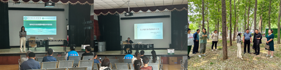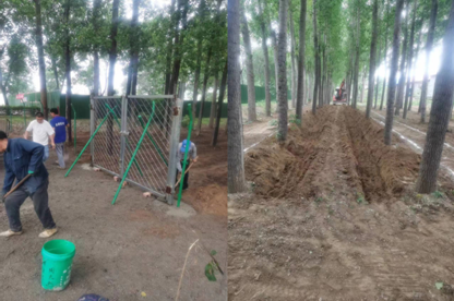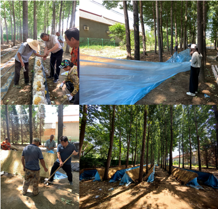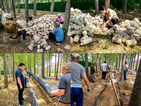 5月16日,李倩倩特邀了北京市昌平区农业技术推广站康勇农艺师、北京谷氏农业专业合作社谷福春和齐静农艺师来到胡辛庄村进行了食用菌种植技术培训。本次培训采取理论教学与实地讲解相结合方式。此外,三位专家还对胡辛庄村的林下食用菌产业发展提出了规划建议,并现场解答了村民关于食用菌种植技术的问题。峪口镇农委负责人、胡辛庄村“两委”负责人、种植大户和村民30余人参加了此次培训。根据培训专家的规划建议,李倩倩与胡辛庄村商议后,计划在村集体所有的杨树林开展小规模林下食用菌种植技术示范。在村委会的全力配合下,仅用1周时间,就完成了林下食用菌种植的准备工作,包括清杂清灌、整地挖沟、引水、修建围挡、购买菌棒等。5月24日,在谷福春农艺师的指导下,李倩倩博士连续数天带领村民将菌棒拆袋、地埋或码放。6月4日,在菌棒出菇前,李倩倩和村民一同为菌棒搭建了由钢筋、棚膜和草帘组成的简易小棚,以保证菌菇质量。该示范项目也得到了北京市食用菌创新团队首席刘宇、岗位科学家马智宏的大力指导与支持。