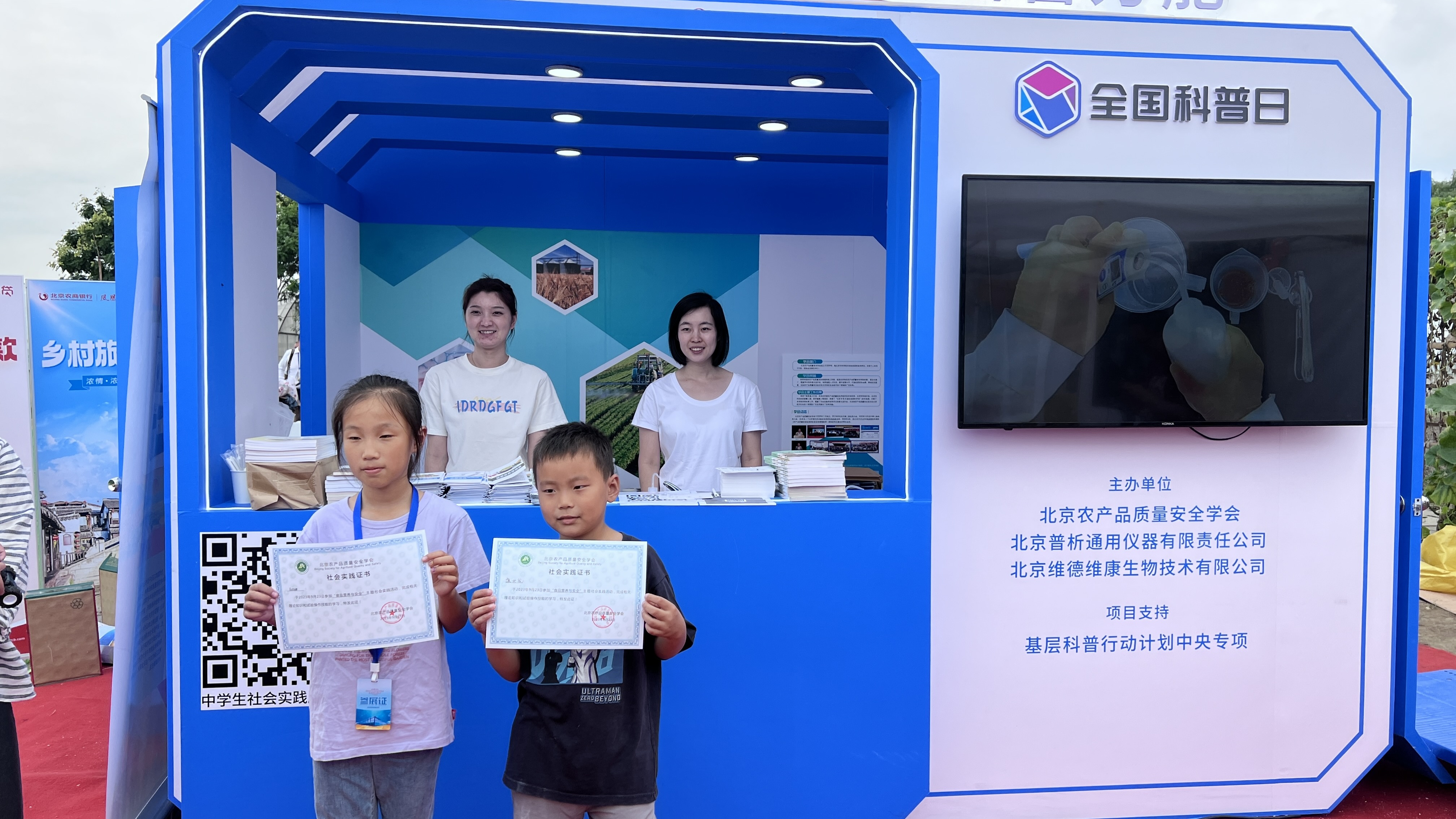 北京农产品质量安全学会作为北京市科协组织的十余家社会组织之一,在会员单位北京普析通用仪器有限责任公司和北京维德维康生物技术有限公司的大力支持下,现场搭建了食品营养与安全科普方舱,设置了果蔬可溶性固形物(糖度)快速检测、果蔬中农药残留多菌灵快速检测和牛奶中三聚氰胺快速检测三个互动实验。学会专家现场指导市民和小朋友开展动手实验,填写实验记录,并向小朋友发放了社会实践证书。