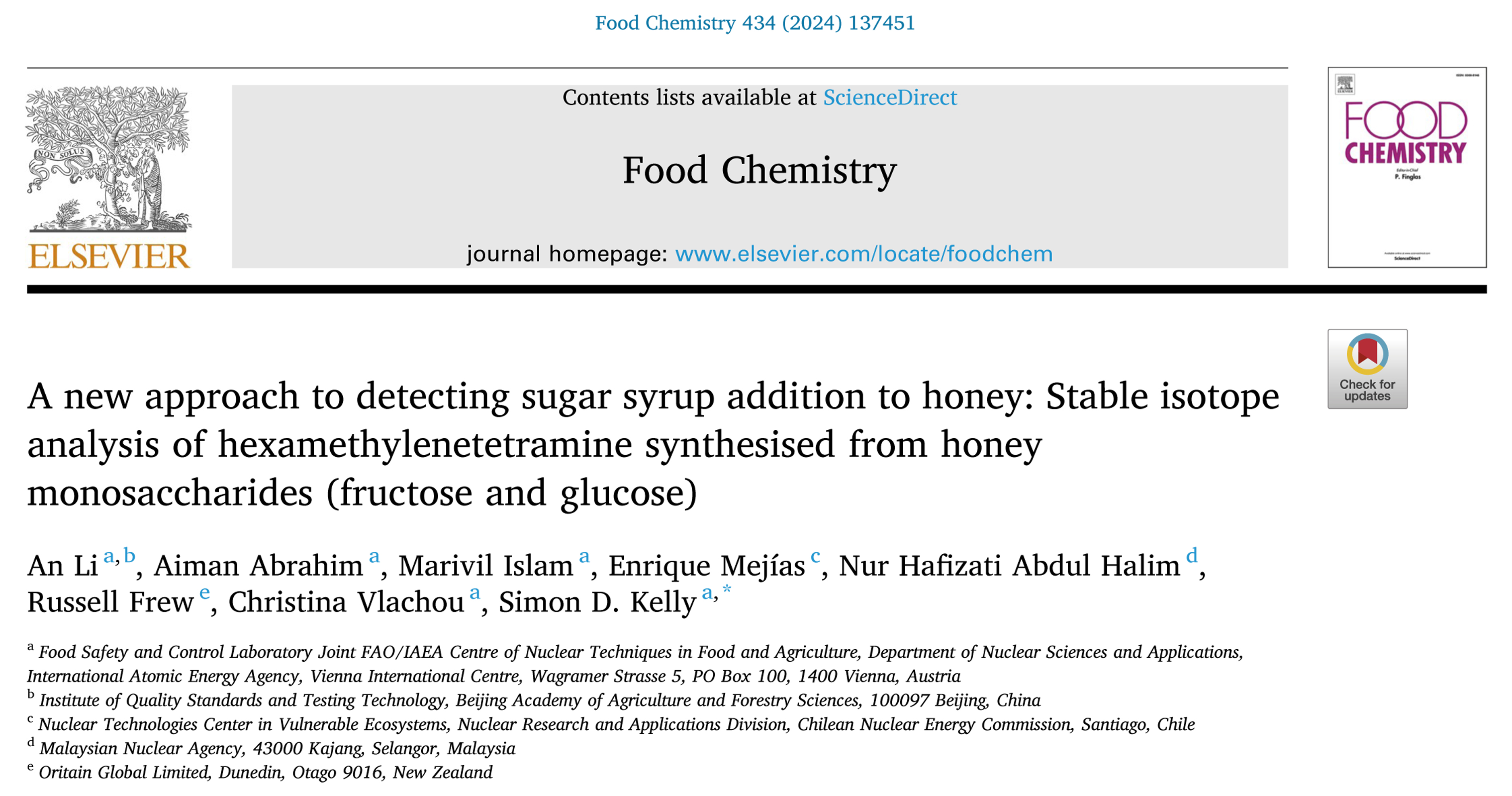 近日,质标所与联合国粮农组织(FAO)/国际原子能机构(IAEA)粮食与农业核技术联合中心(以下简称FAO/IAEA联合中心)在食品科技领域TOP期刊Food Chemistry (IF: 8.8)上发表“A new approach to detecting sugar syrup addition to honey: Stable isotope analysis of hexamethylenetetramine synthesised from honey monosaccharides (fructose and glucose) ”的研究成果。该研究针对蜂蜜氢同位素指纹分析的技术难题,开发了基于衍生化的蜂蜜掺杂外源糖浆鉴别新方法,不仅为蜂蜜真伪鉴定提供了新的技术手段,还为解决多羟基化合物氢同位素测定问题提供了新思路。