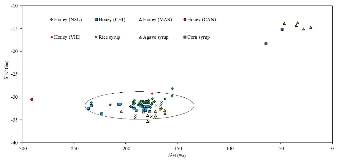 图2 基于稳定性碳氢同位素的不同来源蜂蜜与糖浆区分