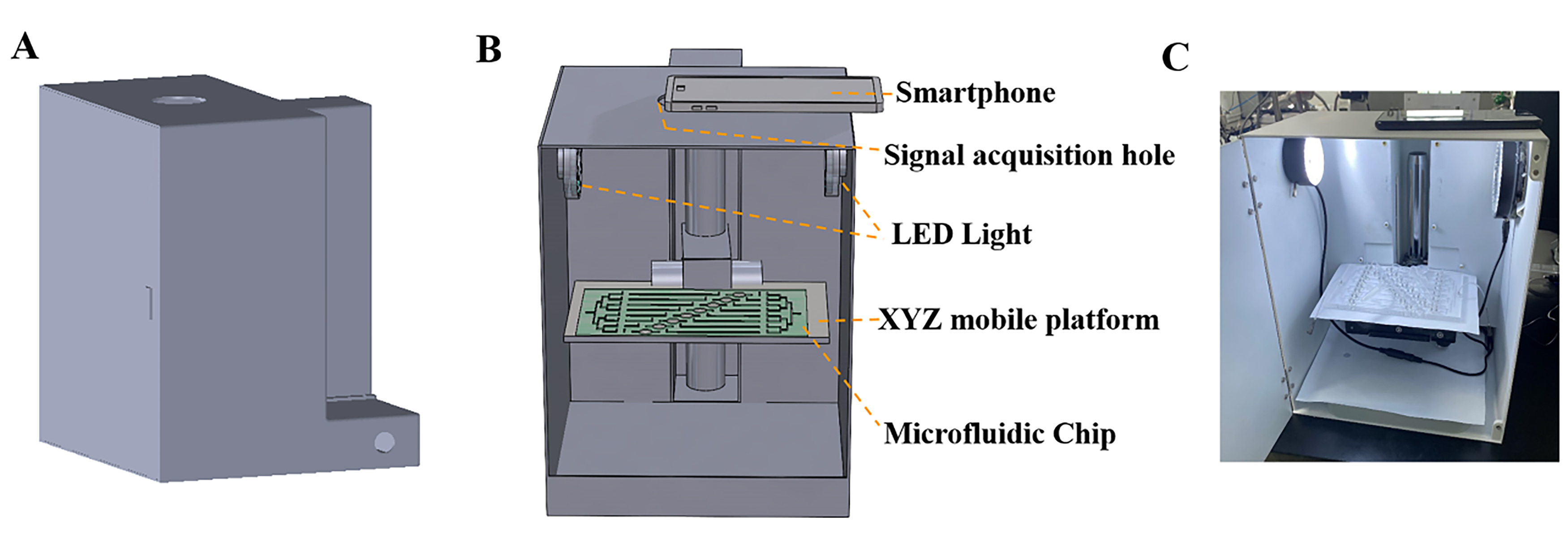 基于此,本文利用微流控浓度梯度比色检测芯片、搭建的信号采集箱和编写的智能手机APP,构建了一种快速、实时、便捷的亚硝酸盐浓度梯度比色检测系统。初始浓度为C0的亚硝酸盐,在设计的微流控芯片上可被自动稀释成具有等差数列特征的8个浓度梯度,浓度分别为0、0.20 C0、0.33 C0、0.46 C0、0.59 C0、0.72 C0,0.86 C0和C0。基于抑制AuNPs信号放大的新型无标记比色法能够检测低至0.14 mg/L的亚硝酸盐,并且具有良好的特异性。此外,我们也通过信号采集箱和智能手机APP对比色信号进行采集和分析。信号采集箱避免了光斑对数据采集的干扰。微流控浓度梯度比色检测系统可在45 min内检测出低至0.43 mg/L的亚硝酸盐。最后通过对加标和未加标的10个实际水样进行分析,考察了微流控浓度梯度比色检测系统的实际应用性,其回收率为94.92% ~ 105.60%。该微流控浓度梯度比色检测系统不需要手动、繁琐、耗时的样品稀释过程,也不需要外部驱动装置和大型检测设备。