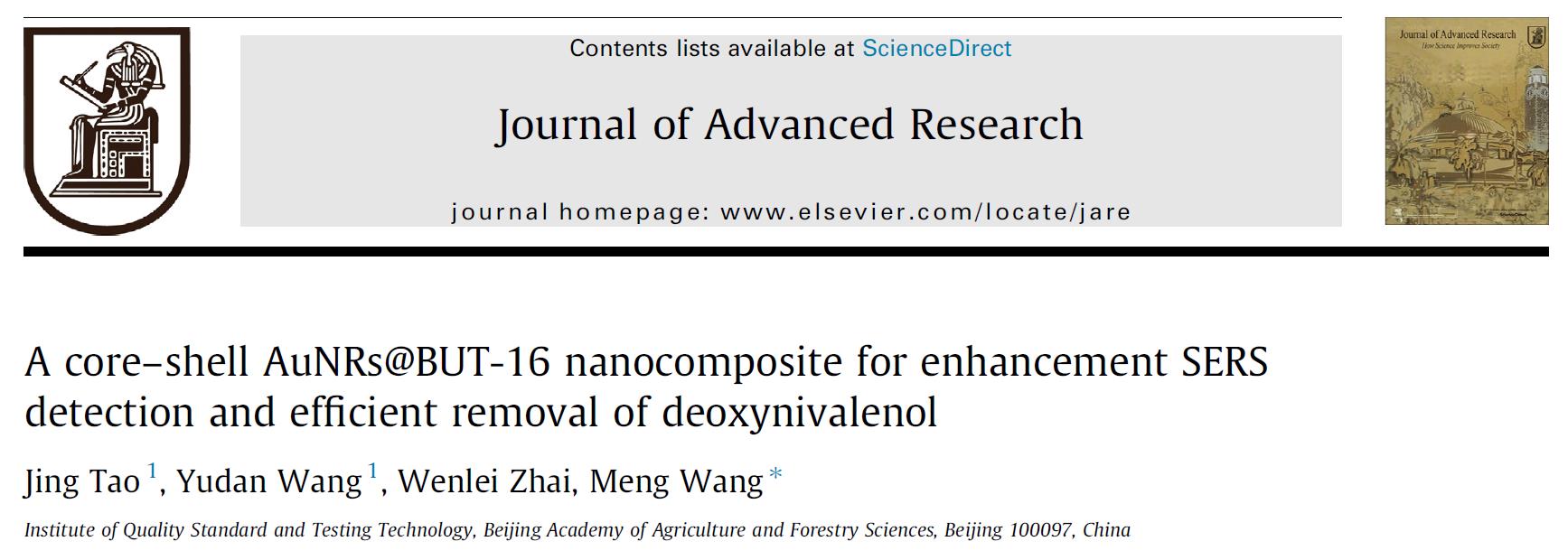 近期,质标所生物毒素与品质评价研究团队在综合性期刊1区TOP期刊Journal of Advanced Research(IF:10.7)在线发表了题为“A core-shell AuNRs@BUT-16 nanocomposite for enhancement SERS detection and efficient removal of deoxynivalenol”的研究论文。该研究应用一锅法制备了一种核壳AuNRs@BUT-16多功能纳米材料,该材料兼具拉曼光谱信号增强和高效吸附DON毒素的优势,进而实现了粮食中DON毒素的快速、高敏、无标记检测与同步去除。