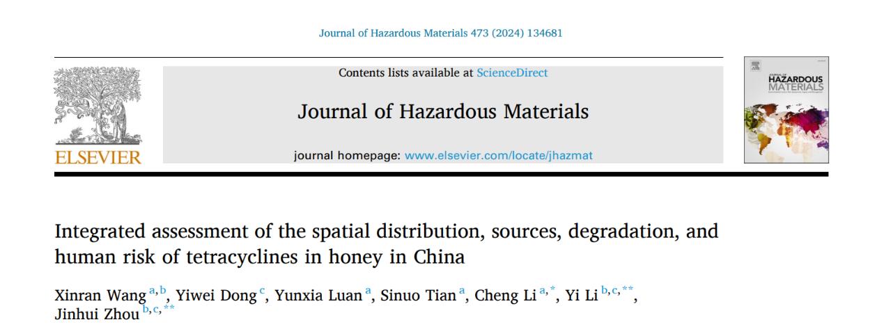 近期,质标所与中国农业科学院农产品加工研究所、蜜蜂研究所合作在环境领域TOP期刊Journal ofHazardous Materials(IF:13.6,中科院1区)上发表了题为“Integrated assessment of the spatial distribution, sources, degradation, and human risk of tetracyclines in honey in China”的论文。该研究评估了我国蜂蜜中四环素类药物分布规律,并根据不同地域和不同年龄阶段的食用习惯不同进行风险评估,探明了四环素族药物在养蜂产业链过程中的残留消除规律。本研究为蜜蜂养殖过程中制定合理的四环素类药物使用规程、管控措施和政策建议提供技术支持。