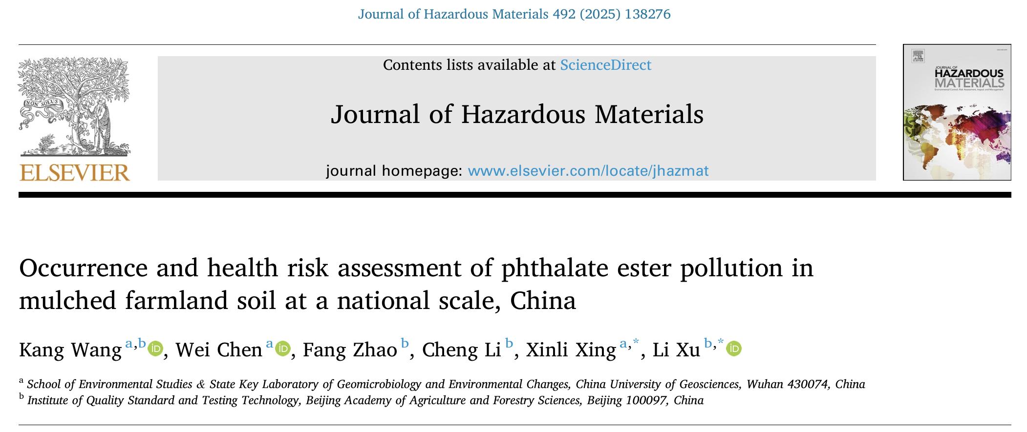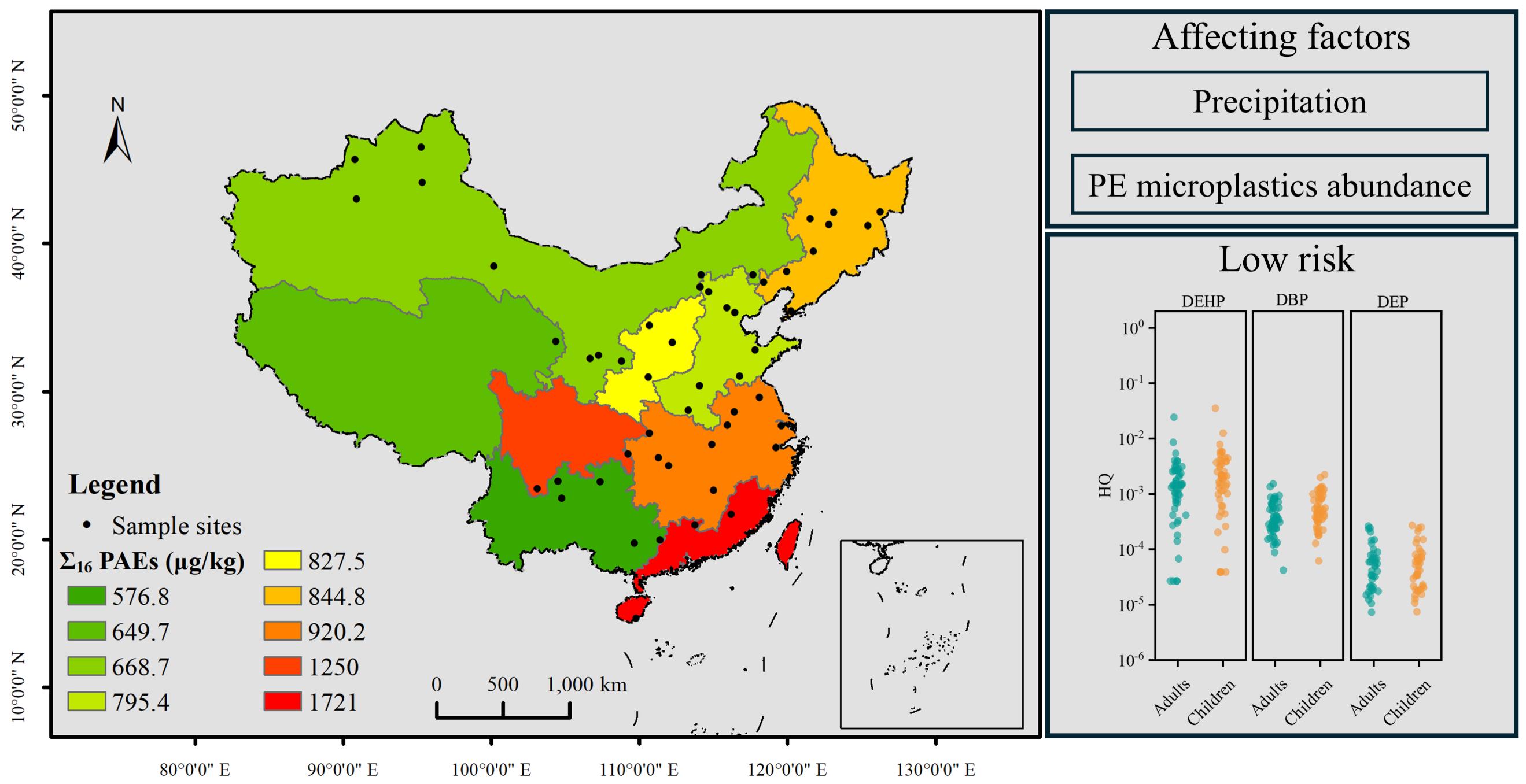 近日,我所农田环境监测与治理科研团队在国际环境领域TOP期刊《Journal of Hazardous Materials》(IF: 12.2,中科院1区)上发表了题为“Occurrence and health risk assessment of phthalate ester pollution in mulched farmland soil at a national scale, China”的研究论文。该研究首次在全国尺度上系统揭示了长期覆膜农田土壤中邻苯二甲酸酯(PAEs)的污染分布特征、驱动因素及健康风险,为农业塑料地膜残留管控和土壤污染治理提供了重要科学依据。