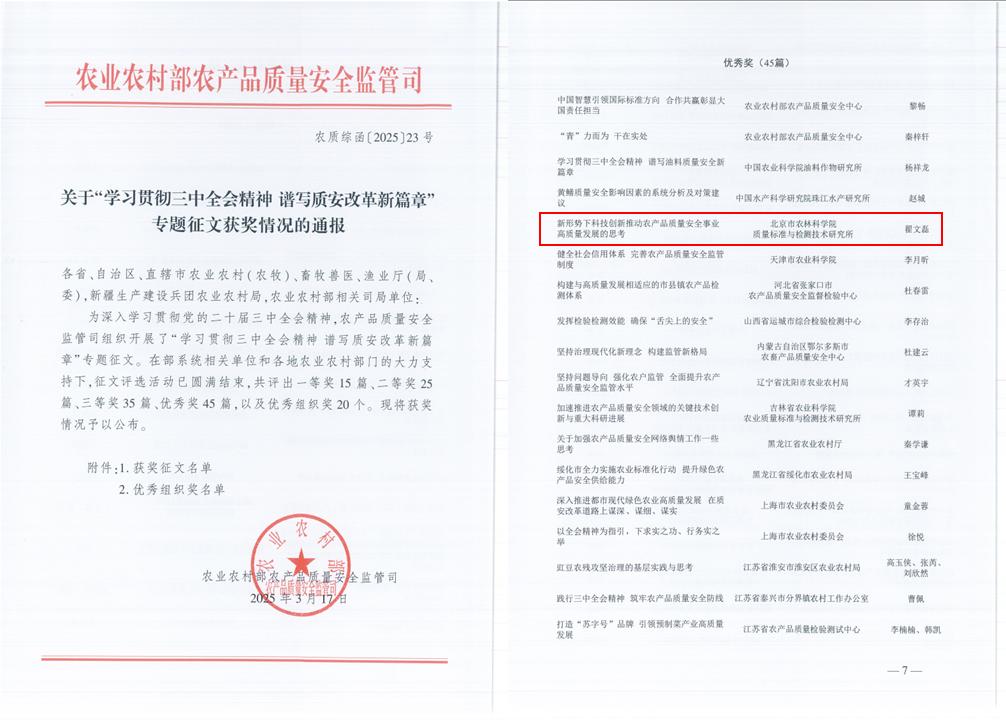 近期,农业农村部农产品质量安全监管司公布了“学习贯彻三中全会精神 谱写质安改革新篇章”专题征文活动获奖结果,我所品质评价与控制科研团队翟文磊副研究员撰写的《新形势下科技创新推动农产品质量安全事业高质量发展的思考》荣获优秀奖。