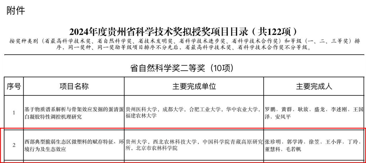 近日,2024年度贵州省科学技术奖拟授奖项目公示,我所参加完成的“西部典型脆弱生态区微塑料的赋存特征、环境行为及生态效应”项目荣获2024年度贵州省自然科学奖二等奖,实现我所省部级自然科学类成果奖励的突破。