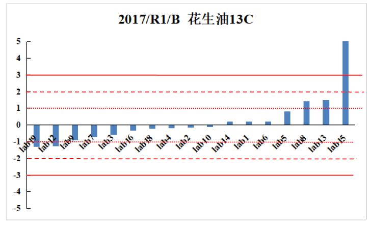 此次能力验证是由中国计量科学研究院联合中国食品发酵工业研究院组织协调。组织协调者给自愿参与的19个单位发放实验室间比对待测样品,并负责对检测结果进行质量评估,目的是为了验证参与者对食品和环境样品中稳定同位素的检测能力以及检测结果的可比性。质标中心参加了水18O、花生油13C、氨基酸13C和氨基酸15N共4项指标的能力验证,并按时上报了检测数据平均值和标准差。组织协调者依照《GBT 28043-2011利用实验室间比对进行能力验证的统计方法》对数据进行处理,分析结果用Z比分数进行统计和评价,当-1≤Z≤1时,认为数据优秀;-2<Z≤2时,认为数据合格;-3<Z≤3时,认为数据有问题;Z>±3时,认为数据不合格。中心上报的4项数据Z比分数值中,3项在-1≤Z≤1范围内,数据优秀;1项指标的Z比分数值-2<Z≤2时,数据合格。