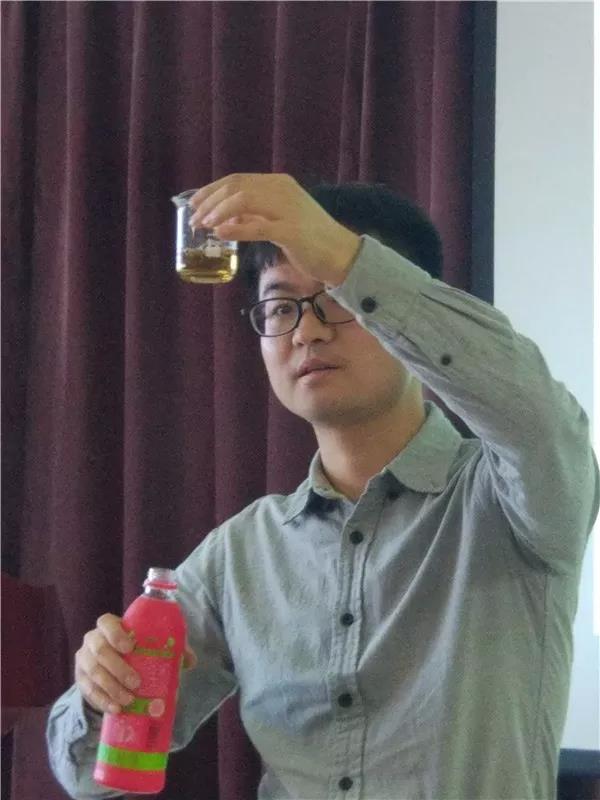 活动开始由科信食品与营养信息交流中心科学技术部主任阮光锋老师给大家带来《食物掉色传说》的科普讲座,不知道大家平时有没有做过紫薯馒头,明明应该是紫色的馒头,但做出来却变成了蓝绿色。其实这都是一种叫做花青素的色素捣的鬼。花青素遇酸会变成红色,遇碱会变成蓝绿色。由于我们发面时会加入泡打粉(小苏打),而泡打粉是碱性的,所以我们的紫薯馒头就会变蓝。为了更加形象地说明花青素的特性,阮光锋老师还跟在场的小朋友们做了几个互动实验。