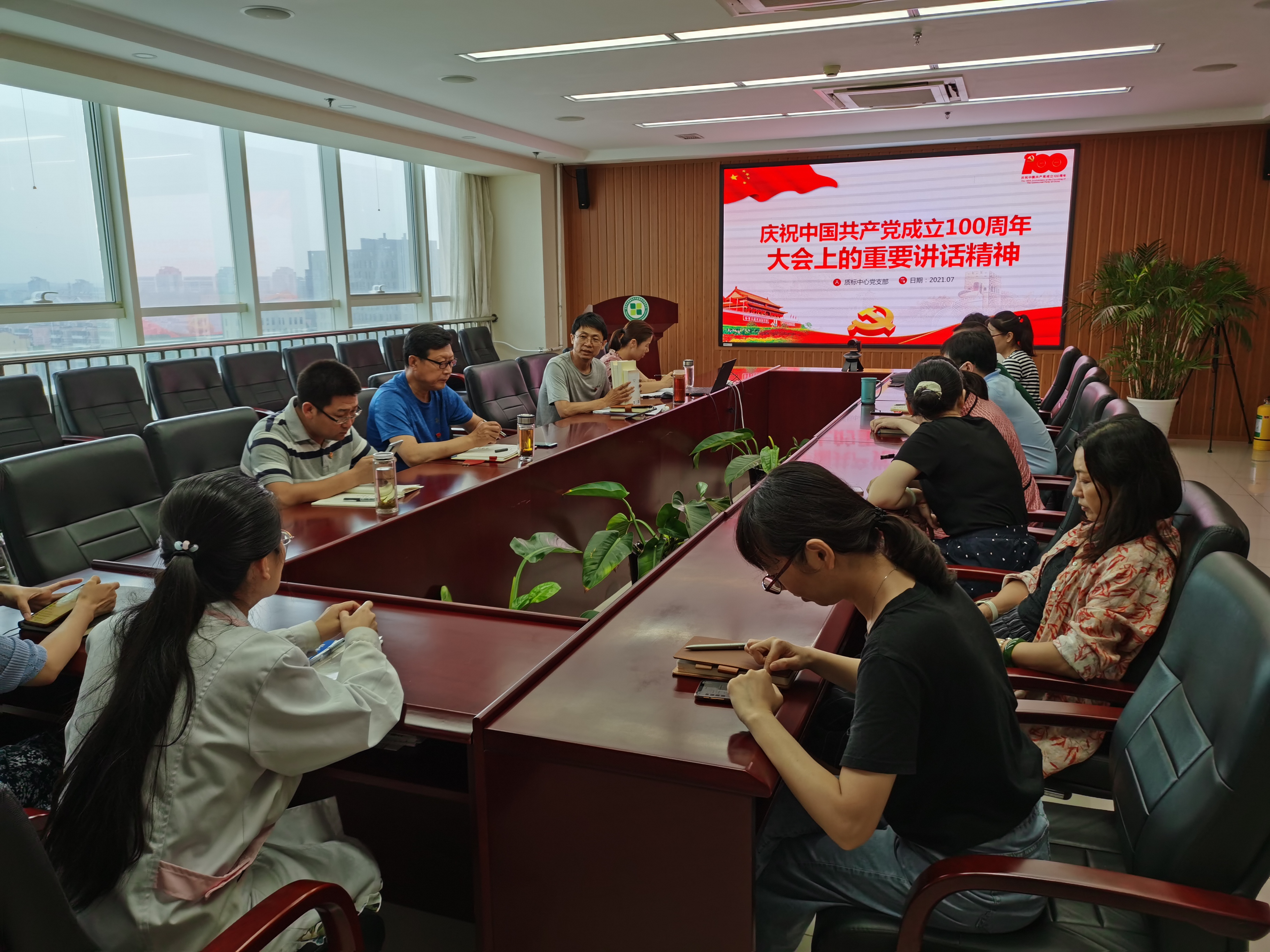 7月15日下午,质标中心召开党员大会,集体学习习近平总书记在庆祝中国共产党成立100周年大会上重要讲话精神。支部书记陈早艳主持会议,中心支部全体党员参加。